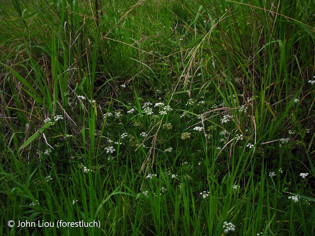 沿著熟悉的路線一路向上,從2004年至今已經7個年頭,溼地似乎只有粗放耕作,而每次耕作圍起的田埂路線好像又有點不太一樣,總之大概方向就是沿著山路往水路上游走,而且是在河的南岸。阿!有了,是水車前。熟悉的景象再次出現在眼光前,不過環境倒沒有太多積水,只見他們幾乎將本應沉水生長的葉片裸露於空氣中,然後堅強的開著花,環境看來有那麼點末世美感。一旁還有點像是龍骨瓣莕菜的玩意,感覺不是野生的,或者說是哪裡漂到這裡的吧,北海岸若要有原生的杏菜屬植物那也非小杏菜莫屬,畢竟東北角的目前還普遍分佈此種,而龍骨瓣杏菜則是高雄美濃的產物,突然跑到北海岸確實很奇怪。另外自2004年觀察以來也不曾在此發現這個物種,就是突然出現非長久生長在此,非常可疑啊,總之就先稱作似龍骨瓣杏菜的植物,改日再來鑑定。 離開淡水後這次並沒有在三芝停留,而是直奔石門電信局。不久前曾在蜻蛉相關的討論區看見水生昆蟲調查,其中描述的石門坑感覺就是石門電信局一帶的山谷,而該水棲昆蟲調查裡確實提到了田字草,檢視照片也無誤呢,看來今天就從電信局旁的小路上山看看。沿路分布著美麗的小白花們,這應該是水芹菜了。再往上走,在大樹下稍作休息禮拜後也看看天氣,午後自大屯山聚集而成的雷雲正在擴大,走著走著眼見前方水道生長著美麗的簀藻,這一上溯不得了,這不就是一植想找的田字草嗎?他們就生長在大樹下的茭白筍田中,環境中有著大量的簀藻與鴨舌草伴生。過去曾稱讚他們是自繪本裡走出的水生植物,如今在野外相遇更能體會其中的每,彷彿隨時會有小精靈自草叢飛出點綴水面最後在田字草上休息...。拍了些許照片後雷雲看似不妙,也就匆匆結束行程了。